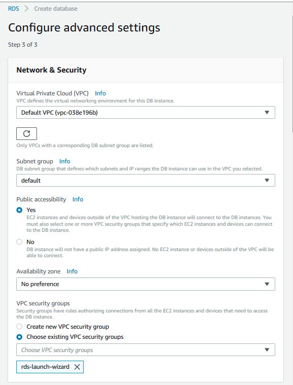 Ini adalah langkah terakhir ketika Anda menyebutkan vpc dan pengaturan keamanan, enkripsi, opsi cadangan dan ekspor log dll. Untuk singkatnya, tangkapan layar telah dipersingkat dan hanya menampilkan opsi akhir.