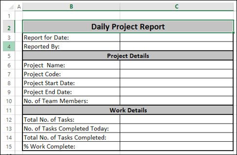Ini menyisakan Anda hanya dengan dua sel - C13 dan C14 yang perlu Anda isi setiap hari. Oleh karena itu, akan ideal untuk memiliki informasi untuk sel lainnya, setiap kali Anda harus membuat laporan. Ini menghemat waktu Anda dan Anda dapat melakukan aktivitas pelaporan biasa hanya dalam beberapa menit.