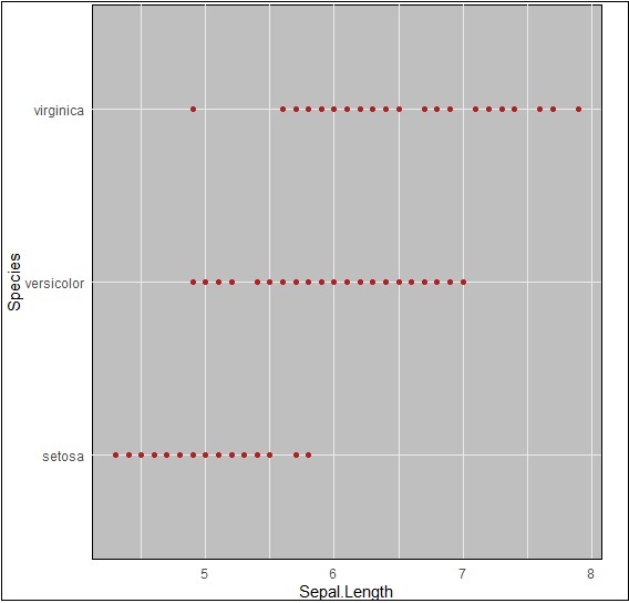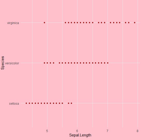 ggplot(iris, aes(Sepal.Length, Species))+geom_point(color="firebrick")+