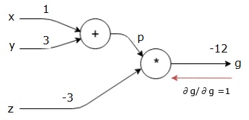 Selanjutnya, kita akan melakukan backward pass melalui operasi "*". Kami akan menghitung gradien pada p dan z. Karena g = p * z, kita tahu bahwa -