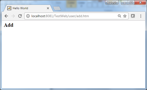 Sekarang, jalankan server Tomcat Anda dan pastikan Anda dapat mengakses halaman web lain dari folder webapps menggunakan browser standar. Sekarang, coba URL -http://localhost:8080/TestWeb/user/add.htm dan kita akan melihat layar berikut, jika semuanya baik-baik saja dengan Aplikasi Web Spring.