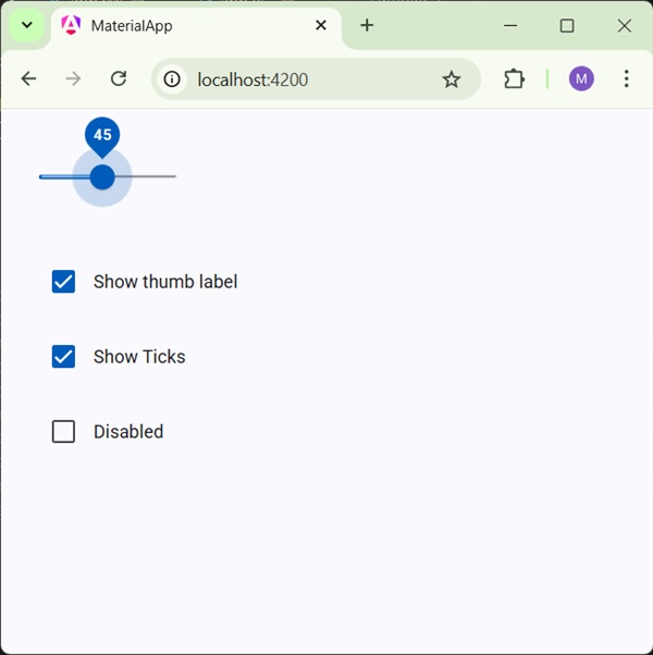 Il <mat-slider>, una direttiva angolare, viene utilizzata come selettore di intervallo avanzato con funzionalità di animazione e stile di progettazione dei materiali.