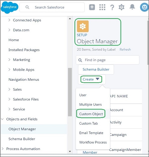 L'oggetto standard più comunemente indicato è chiamato Account Object. È l'oggetto che memorizza le informazioni preliminari su un cliente, partner, concorrente o un'altra organizzazione. Possiamo esplorare l'oggetto account seguendo i passaggi seguenti.
