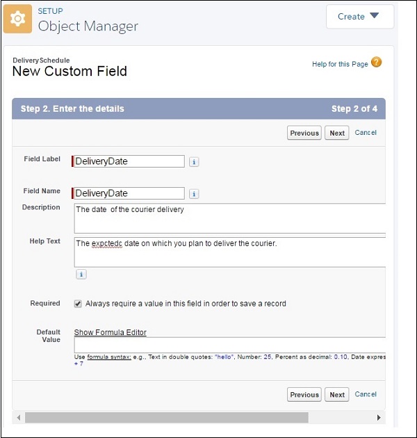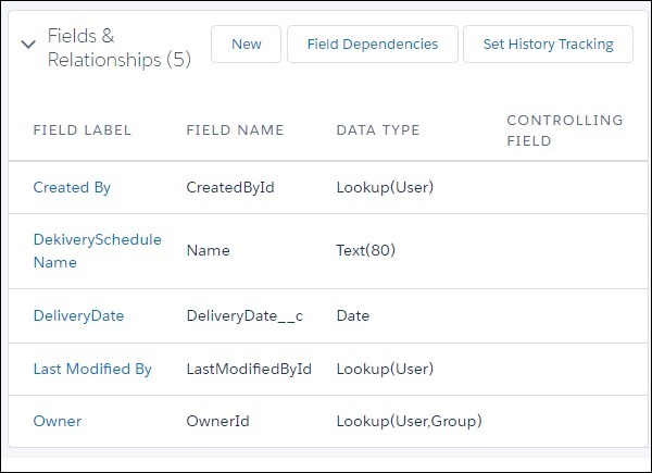 I dati dell'organizzazione non si adatteranno sempre agli oggetti standard esistenti. Quindi possiamo estendere e personalizzare molti oggetti della forza vendita per soddisfare questa esigenza. Ad esempio, un corriere può creare un oggetto personalizzato per memorizzare la pianificazione e i dettagli di spedizione per ogni settimana. Quindi questi oggetti memorizzano i dati che sono univoci per l'azienda. Gli oggetti personalizzati possono anche avere campi personalizzati insieme ai campi standard disponibili in Salesforce.