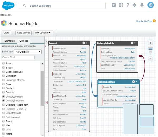 In questo passaggio, fare clic su Schema Builder. Mostra la tabella Account completa con i nomi dei campi e i tipi di dati. Ci sono campi contrassegnati in rosso. I campi contrassegnati in rosso indicano che è obbligatorio compilare i campi quando viene creato un account.