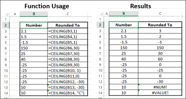 CEILING 함수는 0에서 가장 가까운 유효 배수로 반올림 된 숫자를 반환합니다.