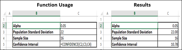 CONFIDENCE 함수는 정규 분포를 사용하여 모집단 평균에 대한 신뢰 구간을 반환합니다.