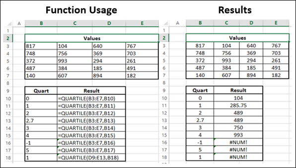 quart <0 또는 quart> 4이면 QUARTILE에서는 #NUM! 오류 값.