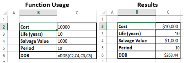 이중 체감 법은 가속 된 비율로 감가 상각을 계산합니다. 감가 상각은 첫 번째 기간에 가장 높고 연속 기간에 감소합니다. DDB는 다음 공식을 사용하여 일정 기간 동안의 감가 상각을 계산합니다.