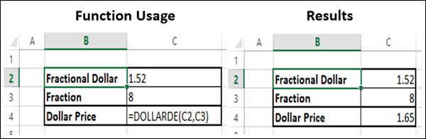 DOLLARDE 함수는 정수 부분과 분수 부분 (예 : 1.02)으로 표현 된 달러 가격을 10 진수로 표현 된 달러 가격으로 변환합니다. 보안 가격에 분수 달러 숫자가 사용되는 경우가 있습니다. 값의 분수 부분은 지정한 정수로 나뉩니다.