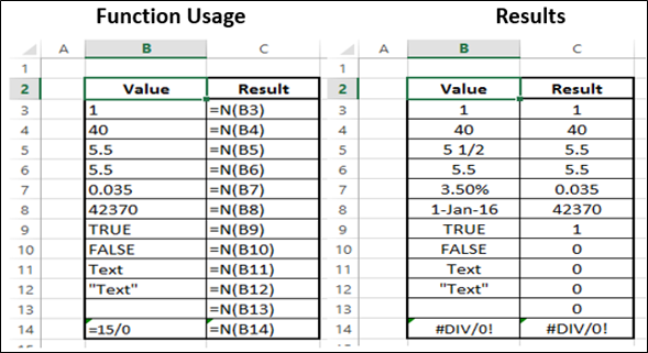 Excel에서 필요에 따라 값을 자동으로 변환하므로 수식에서 N 함수를 사용하여 값을 숫자로 변환 할 필요가 없습니다. 이 기능은 다른 스프레드 시트 프로그램과의 호환성을 위해 제공됩니다.