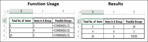 COMBIN 함수는 주어진 항목 수에 대한 조합 수를 반환합니다. COMBIN을 사용하여 주어진 항목 수에 대해 가능한 총 그룹 수를 결정합니다.