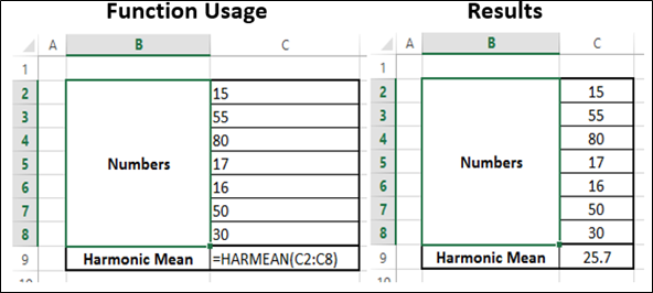 HARMEAN 함수는 데이터 세트의 조화 평균을 반환합니다. 조화 평균은 역수 산술 평균의 역수입니다.