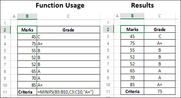 MINIFS (min_range, criteria_range1, criteria1, [criteria_range2, criteria2], ...)