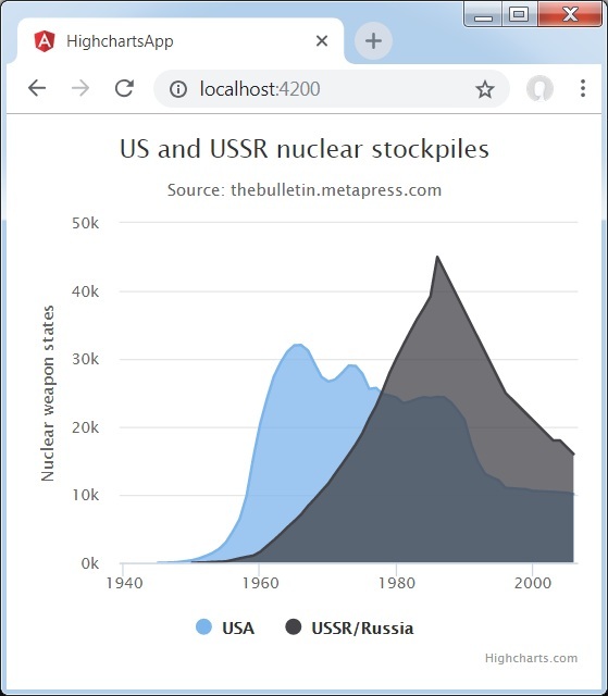 Highcharts 구성 구문 장 에서이 차트를 그리는 데 사용 된 구성을 이미 살펴 보았습니다 . 이제 기본 영역 차트를 더 이해하기 위해 다음 예제를 고려해 보겠습니다.