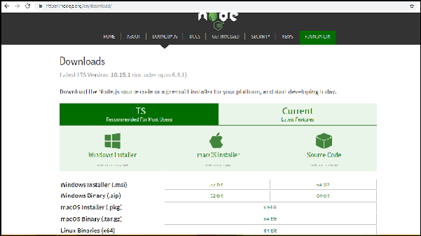 아무것도 인쇄되지 않으면 시스템에 nodejs를 설치하십시오. nodejs를 설치하려면 홈페이지로 이동하여https://nodejs.org/en/download/nodejs의 OS에 따라 패키지를 설치하십시오.
