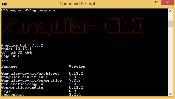 유형 npm install –g @angular/cli명령 프롬프트에서 시스템에 각도 CLI를 설치합니다. 설치하는 데 시간이 걸리며 완료되면 아래 명령을 사용하여 버전을 확인할 수 있습니다.