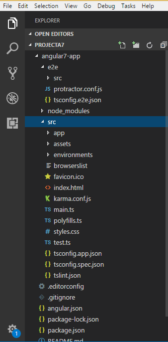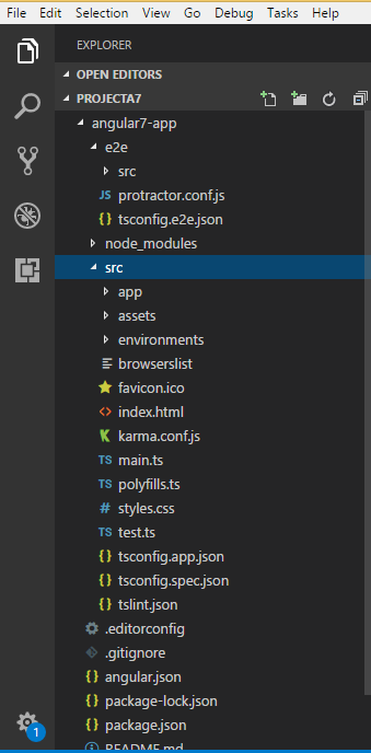 우리는 고려할 것입니다 angular7-app계획. 열어 보자angular7-app 폴더 구조가 어떻게 보이는지 확인하십시오.