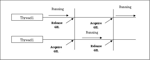 파이썬 세계에서 가장 논란이 많은 주제 중 하나입니다. CPython에서 GIL은 상호 배제 잠금 (mutex)으로 스레드를 안전하게 만듭니다. 즉, GIL이 여러 스레드가 Python 코드를 병렬로 실행하는 것을 방지한다고 말할 수 있습니다. 잠금은 한 번에 하나의 스레드 만 보유 할 수 있으며 스레드를 실행하려면 먼저 잠금을 획득해야합니다. 아래 다이어그램은 GIL의 작동을 이해하는 데 도움이됩니다.