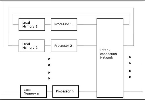 NUMA 멀티 프로세서 모델에서 액세스 시간은 메모리 워드의 위치에 따라 다릅니다. 여기서 공유 메모리는 로컬 메모리라고하는 모든 프로세서에 물리적으로 분산됩니다. 모든 로컬 메모리 모음은 모든 프로세서에서 액세스 할 수있는 전역 주소 공간을 형성합니다.