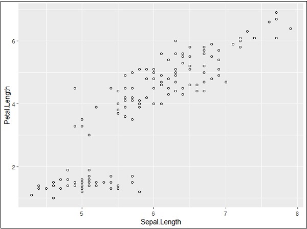 첫 번째 매개 변수는 데이터 세트를 입력으로 사용하고 두 번째 매개 변수는 데이터베이스에 그려야하는 범례 및 속성을 언급합니다. 이 예에서는 범례 Species를 사용하고 있습니다. Geom_point ()는 다음 장에서 자세히 설명 할 산점도를 의미합니다.