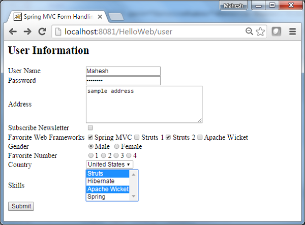여기에서 우리는 <form:select /> 태그, 속성 포함 multiple=trueHTML 목록 상자를 렌더링합니다. 예를 들면-