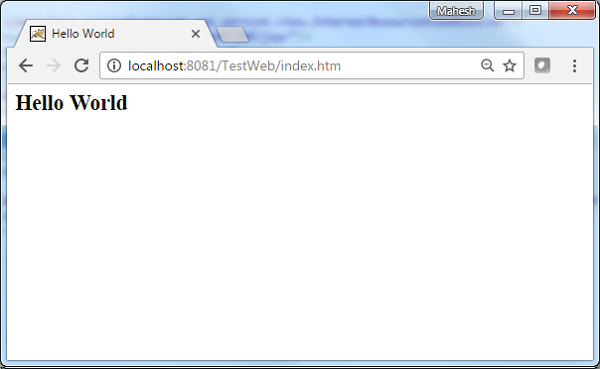이제 Tomcat 서버를 시작하고 표준 브라우저를 사용하여 webapps 폴더에서 다른 웹 페이지에 액세스 할 수 있는지 확인하십시오. 이제 URL을 시도해보세요.http://localhost:8080/TestWeb/index.htm Spring Web Application에 문제가 없으면 다음 화면이 표시됩니다.
