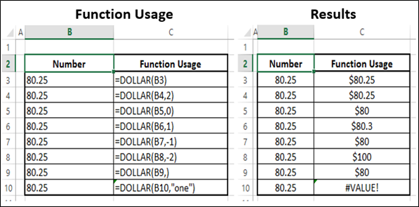 DOLLAR (number, [decimals])