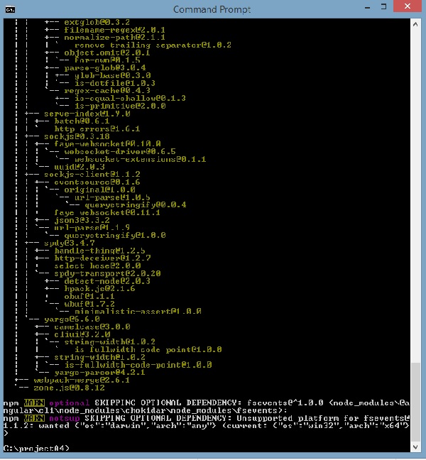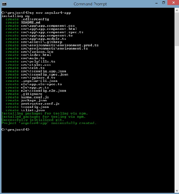 O projeto Angular 4-appfoi criado com sucesso. Ele instala todos os pacotes necessários para que nosso projeto seja executado no Angular 4. Vamos agora mudar para o projeto criado, que está no diretórioAngular 4-app. Altere o diretório na linha de comando -cd Angular 4-app.