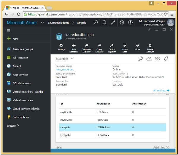 Para usar o Microsoft Azure DocumentDB, você deve criar uma conta DocumentDB. Neste capítulo, criaremos uma conta DocumentDB usando o portal do Azure.