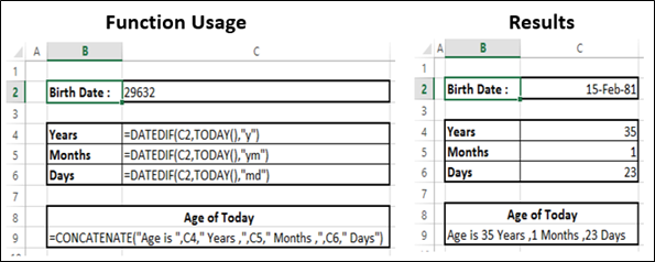 Функция РАЗНДАТ полезна в формулах, в которых необходимо вычислить возраст.