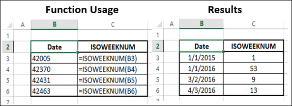 Функция ISOWEEKNUM возвращает номер недели по ISO в году для заданной даты.
