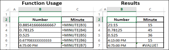 Если предоставленный serial_number не является допустимым временем Excel, МИНУТА возвращает # ЗНАЧ! значение ошибки.