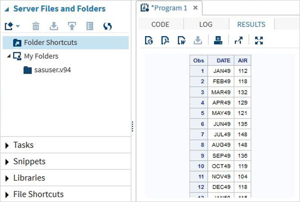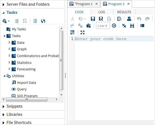 Вкладка «Задачи» предоставляет возможности для использования встроенных программ SAS, предоставляя только входные переменные. Например, в папке статистики вы можете найти программу SAS, которая выполняет линейную регрессию, предоставляя только имя набора данных SAS и имена переменных.