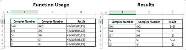 IMSUB関数は、2つの複素数の差をx + yiまたはx + yjテキスト形式で返します。複素数を減算する場合、実数係数と虚数係数は別々に減算されます。つまり、複素数a + biから複素数c + diを減算する式は-です。