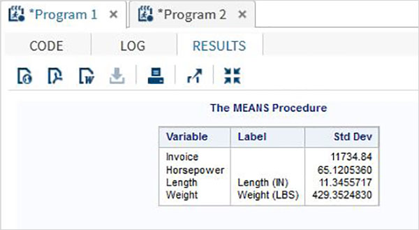 以下の例では、SASHELPライブラリのCARSデータセットからデータセットCARS1を作成します。PROC平均ステップでSTDオプションを選択します。
