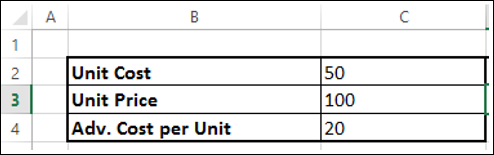 ค่าเริ่มต้นสำหรับงบประมาณการโฆษณากำหนดไว้ที่ 10,000 ต่อไตรมาส (เซลล์ - C8 และ D8)