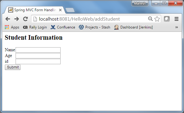 ตอนนี้เริ่มเซิร์ฟเวอร์ Tomcat ของคุณและตรวจสอบให้แน่ใจว่าคุณสามารถเข้าถึงหน้าเว็บอื่น ๆ จากโฟลเดอร์ webapps โดยใช้เบราว์เซอร์มาตรฐาน ลองใช้ URL -http://localhost:8080/HelloWeb/addStudent และเราจะเห็นหน้าจอต่อไปนี้หากทุกอย่างเรียบร้อยดีกับ Spring Web Application