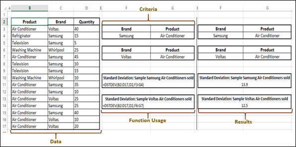 DSTDEV işlevi, belirlediğiniz koşullarla eşleşen bir liste veya veritabanı sütunundaki sayıları kullanarak bir örneğe dayalı olarak bir popülasyonun standart sapmasını tahmin eder.