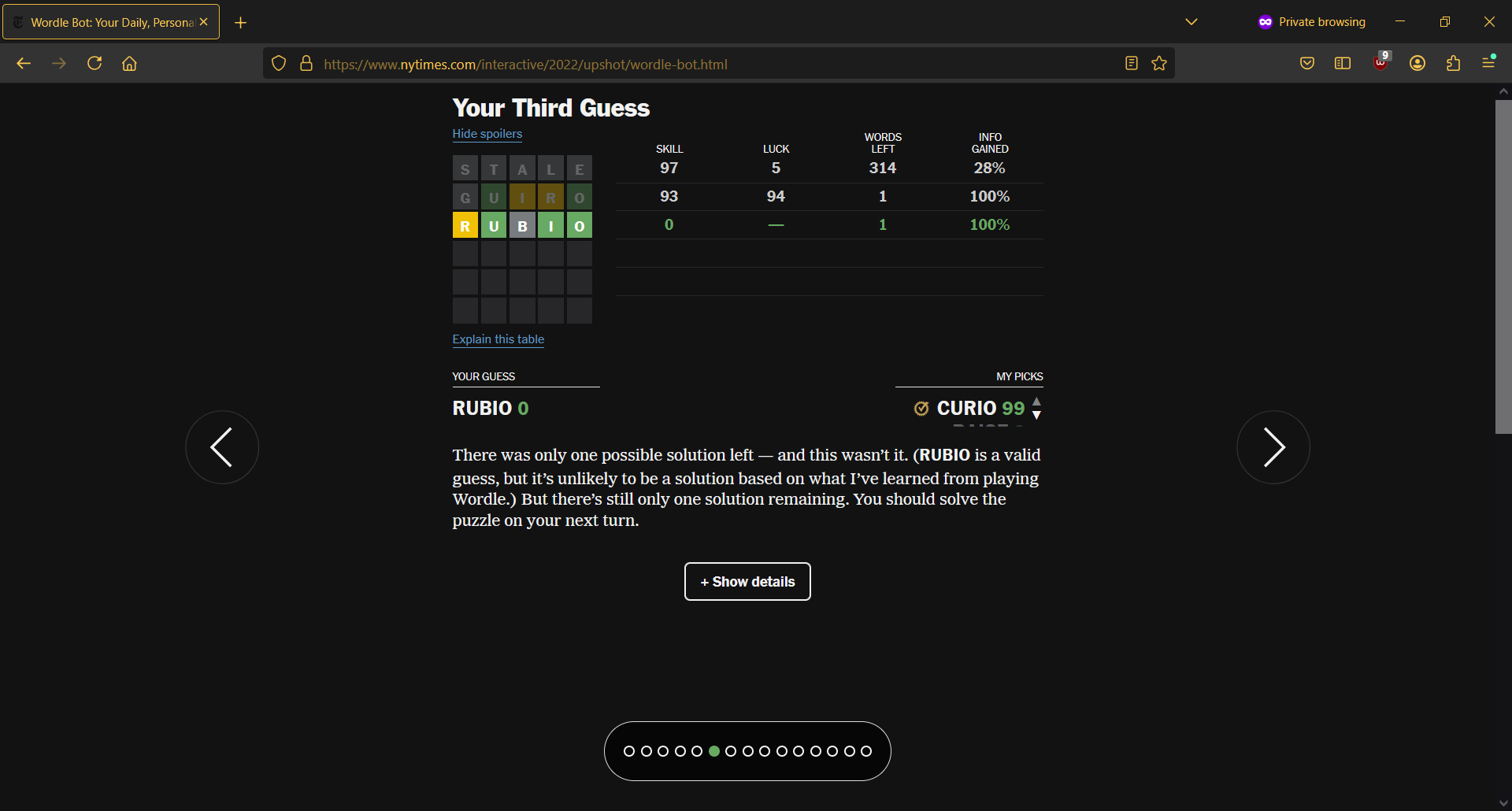 🟩🟩🟩🟩🟩 A+I have no idea why my third guess gave me a skill score of 0